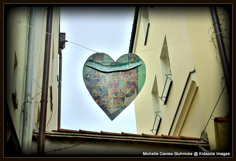 During the morning info-walk on Day 10 of our river cruise, we saw a wonderful array of large colourful love heart collages strung high above the cobblestone streets in the city centre of Passau.
